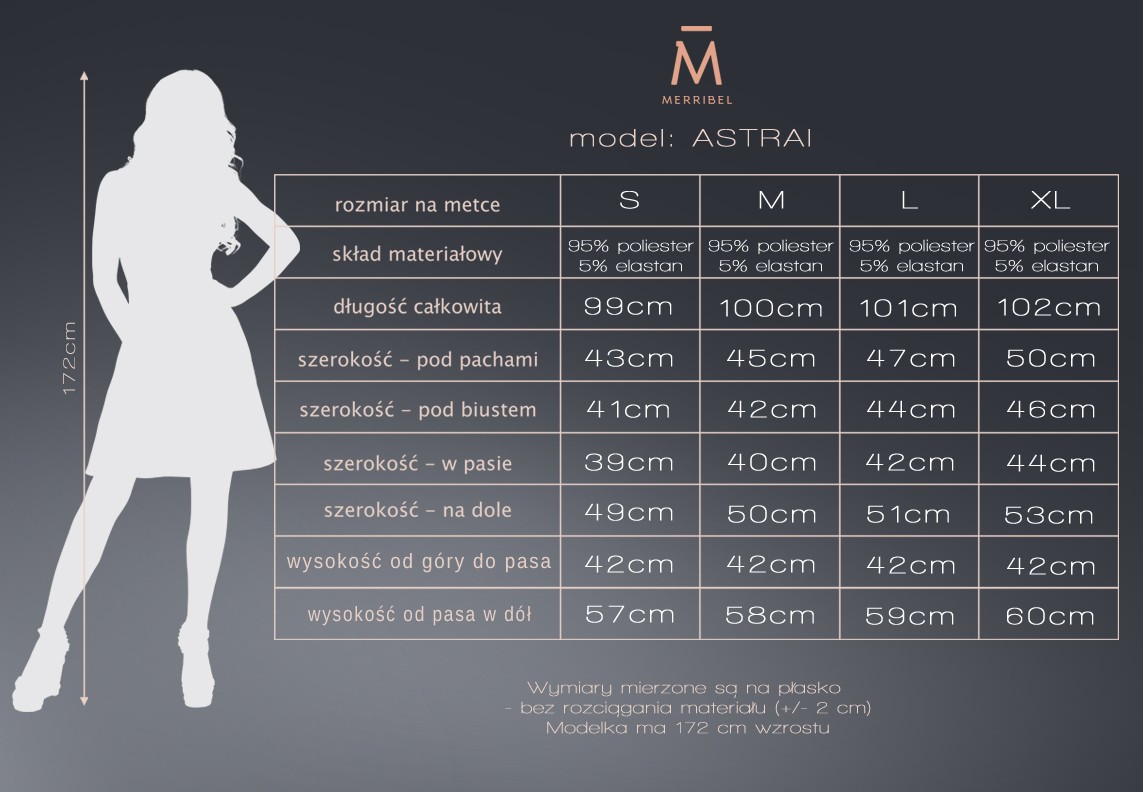 Sukienka Astrai w kolorze czarnym dostępna jest w czterech rozmiarach: S, M, L, XL. Skład materiałowy to 95% POLYESTER 5% ELASTANE