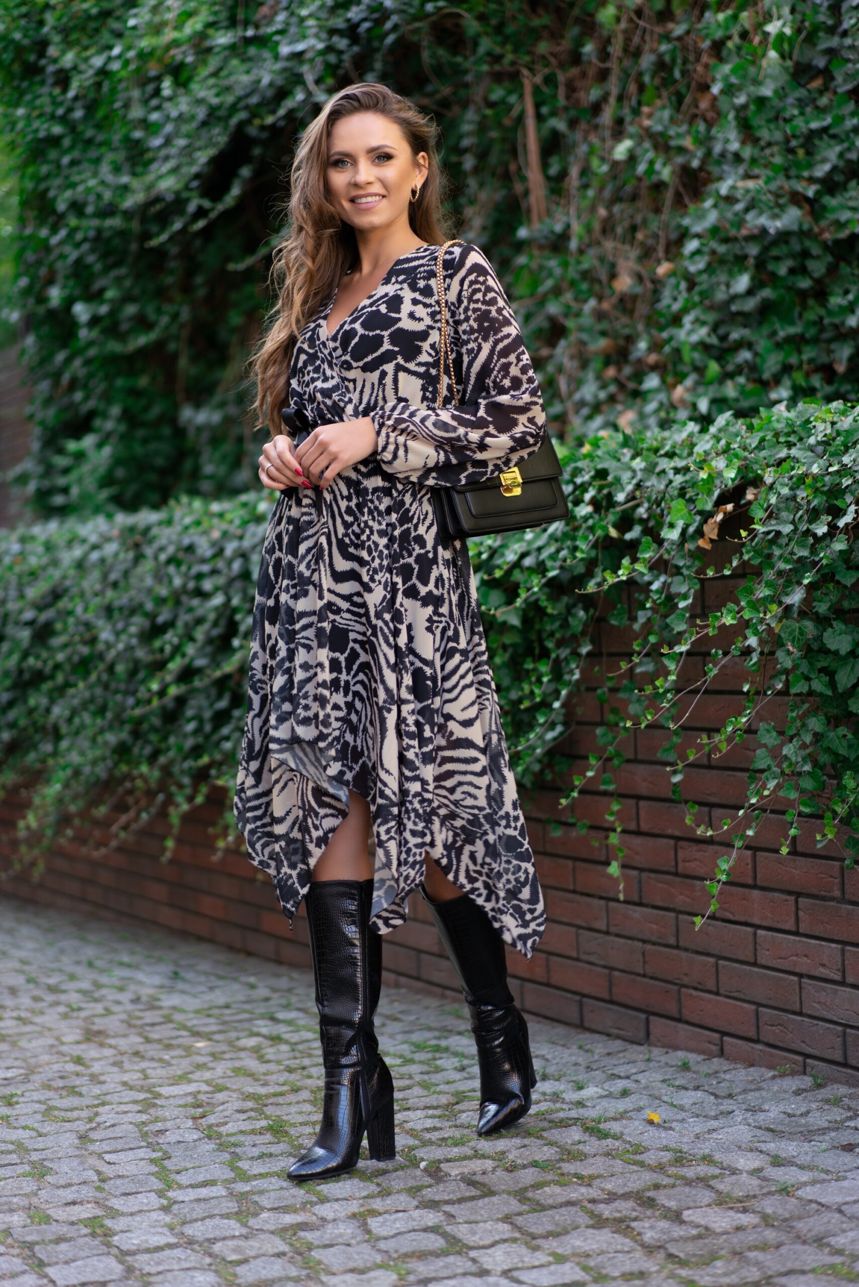 Sukienka Nemey z modnym printem, w kolorze czarno – beżowym, dostępna w rozmiarze: Rozmiar uniwersalny. Skład materiałowy to; 100% POLYESTERSUKIENKA