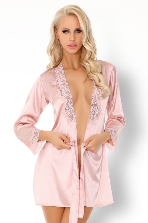 Niezwykle elegancki i kobiecy komplet bielizny z satyny w kolorze pudrowego różu. Koszulka na cienkich, regulowanych ramiączkach, której dekolt i rozcięcie z jednego boku ozdobiono misterną, jasnoróżową koronką. Przód i długie rękawy szlafroka wiązanego w talii paskiem, obszyte koronką. Długość kompletu sięga do połowy uda, w zestawie stringi.